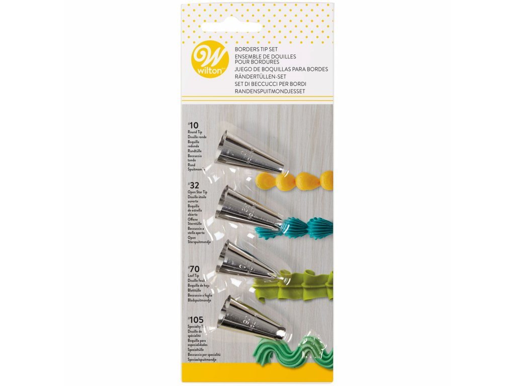 Tuto čtyřdílnou sadu hrotů Wilton lze použít k základním technikám zdobení a k rychlému vytvoření čar, teček, lemu mušlí, krásných řasení listů a výrazných okrajů.